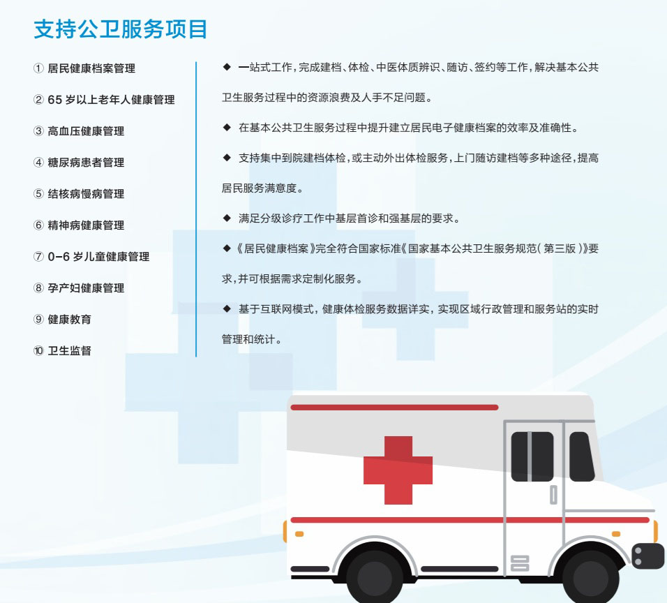 支持國家公衛(wèi)體檢,《居民健康檔案》完全符合國家標準《國家基本公共衛(wèi)生服務(wù)規(guī)范(第三版)》要求。